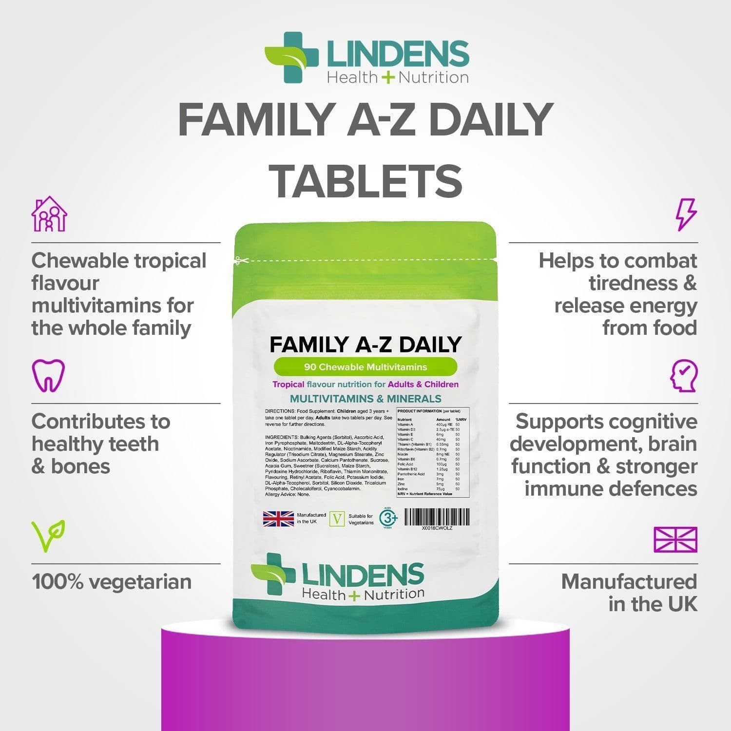 CHEWABLE TROPICAL FLAVOUR MULTIVITAMINS — Lindens Family A-Z Daily provides a tasty multivitamin tablet for the whole family, containing 14 vitamins and minerals! Loved by adults and children aged 3 years and over and suitable for vegetarians