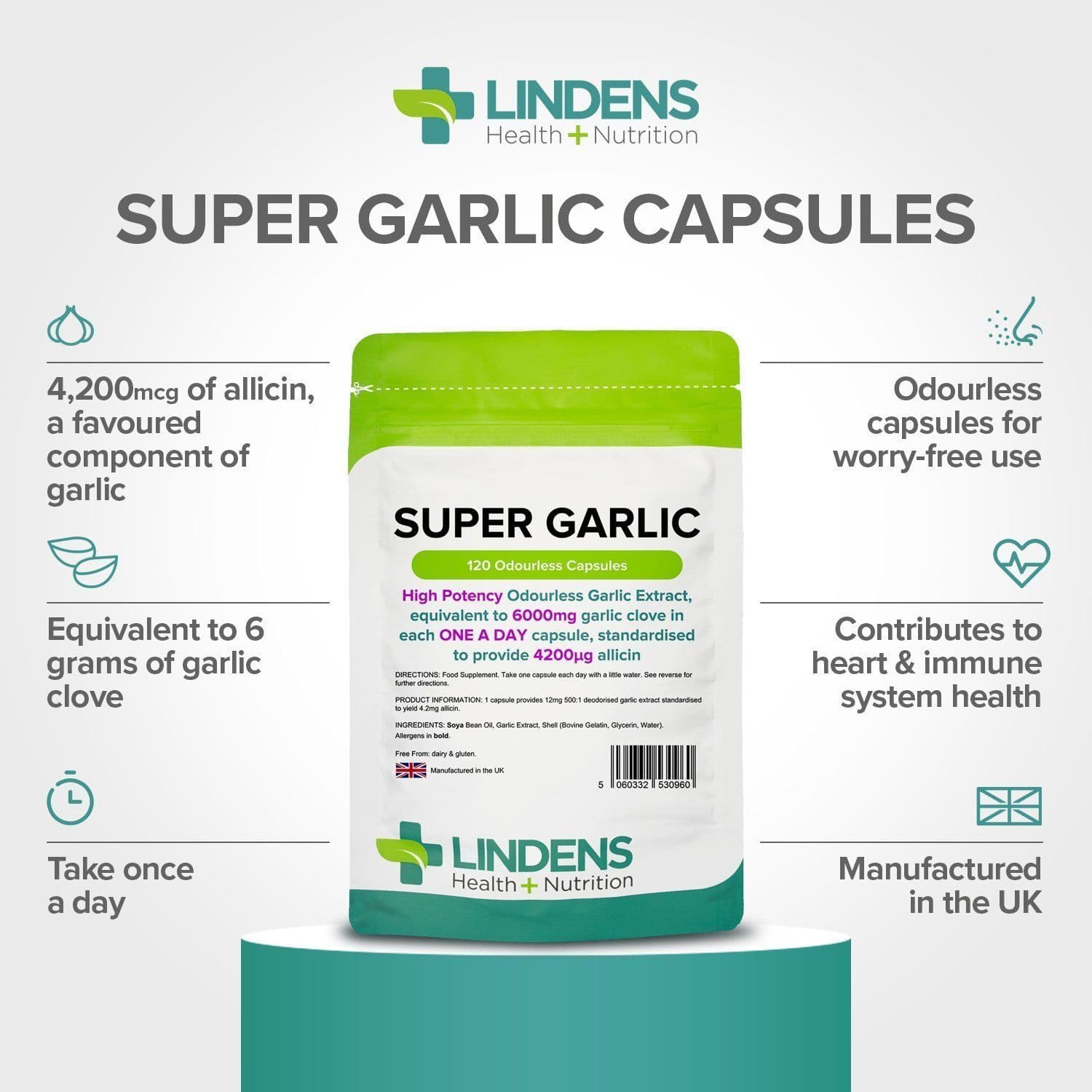 TRIED & TRUSTED QUALITY — Lindens Health + Nutrition is leading the way in consumer nutrition supplements. Our Super Garlic capsules are packaged in foil-fresh, resealable and light-proof pouches and manufactured in the UK!