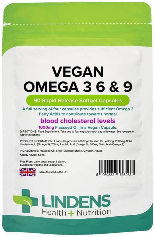 Look after your mind and body with Lindens omega 3, 6 and 9 supplement gives you all the benefits of these three vital fatty acids in a vegan alternative made with flaxseed oil! Our high-potency capsules contribute to the maintenance of healthy blood cholesterol levels and support the normal function of the brain, heart and eyes! Each easy-to-swallow softgel capsule contains 1000mg eicosapentaenoic acid (EPA) and 440mg docosahexaenoic acid (DHA), and a daily serving of 4 capsules provides 2000mg of omega 3 (alpha-linolenic acid), 700mg of omega 6 (linoleic acid) and 800mg of omega 9 (oleic acid)! Lindens Health + Nutrition is leading the way in consumer nutrition supplements to give you tried and trusted quality with all our products! Our vegan omega 3, 6 and 9 supplement is packaged in foil-fresh, resealable and light-proof pouches and manufactured right here in the UK!